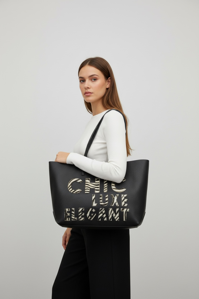 Μαύρη σικ δερμάτινη τσάντα ώμου με zebra-print calf-hair λεπτομέρειες. Διαθέτει εσωτερικό τσαντάκι το οποίο μπορεί να χρησιμοποιηθεί ξεχωριστά και ως πορτοφόλι.