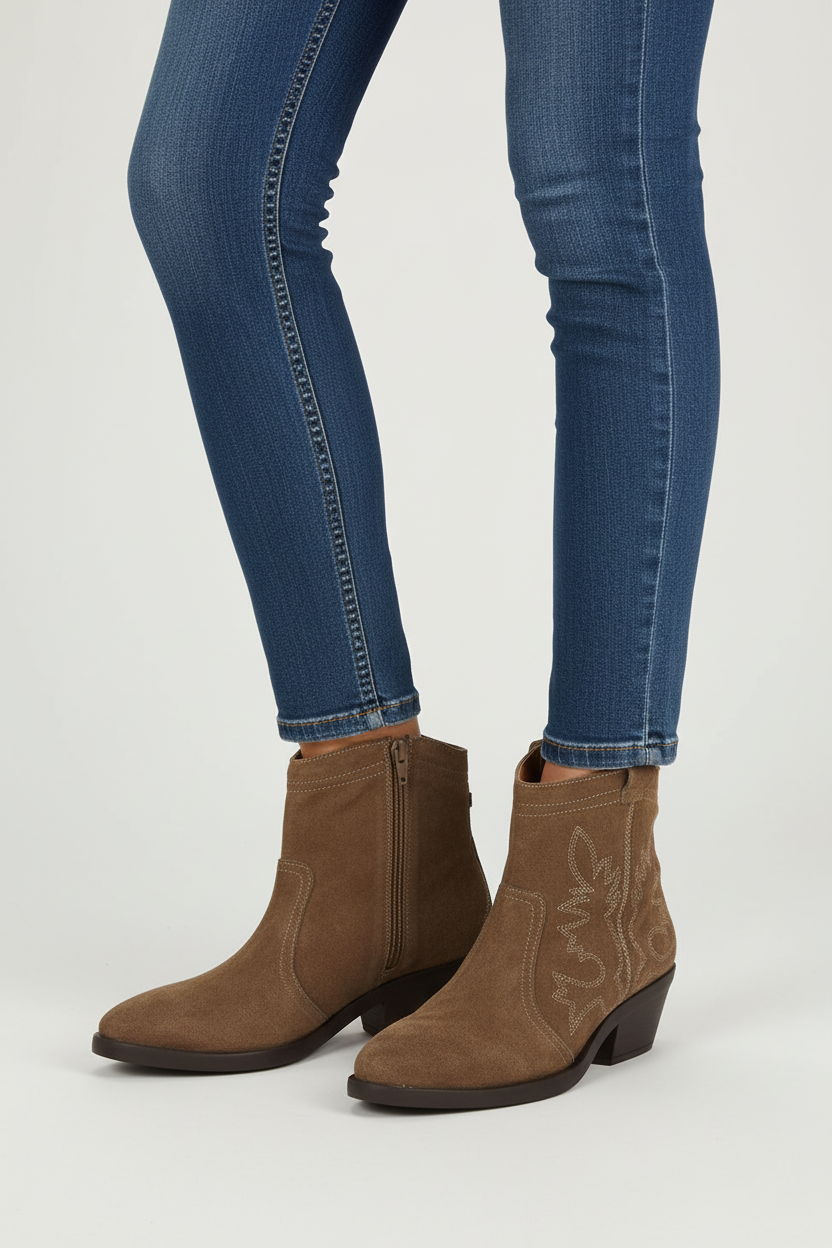The Western trend will be unbeatable this season! Taupe cowboy-style ankle boots made of suede leather with low heel and embroidery. They feature a very cushioned leather insole and flexible sole. The lining, upper, and insole have been made with leather tanned in tanneries that follow a more sustainable process according to Leather Working Group (LWG) standards. The yarn used in the lining fabric has the Global Recycle Standard (GRS) certified guarantee.