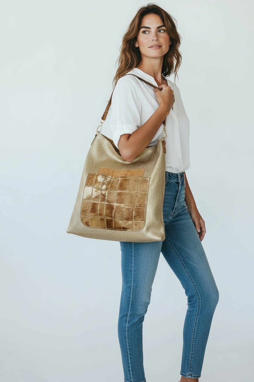 Gold with taba leather shoulder bag with multilayers art leather . It has lots of space with zippers closure. Also, it provides two internal cases and extra adjustable strap to hold it crossbody.