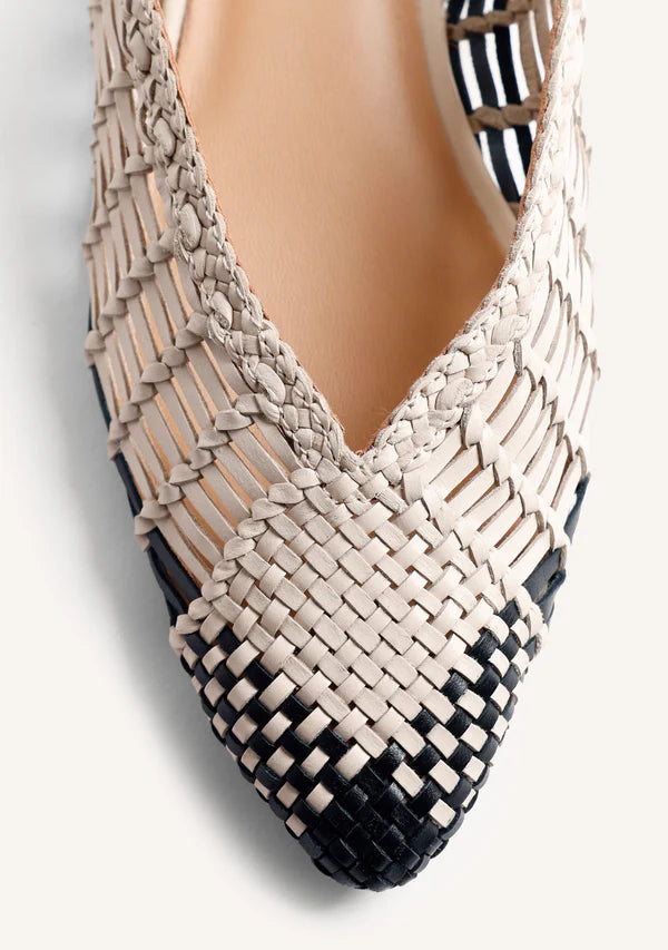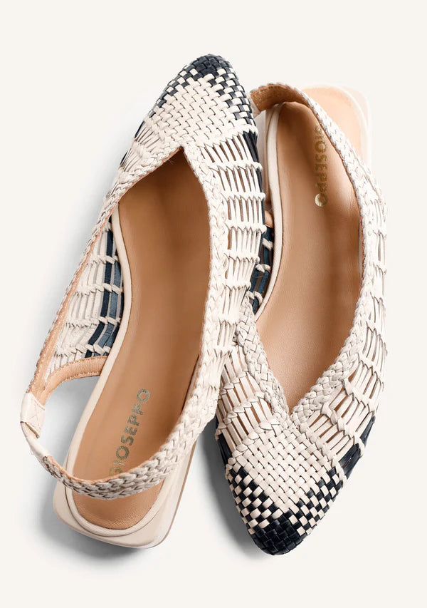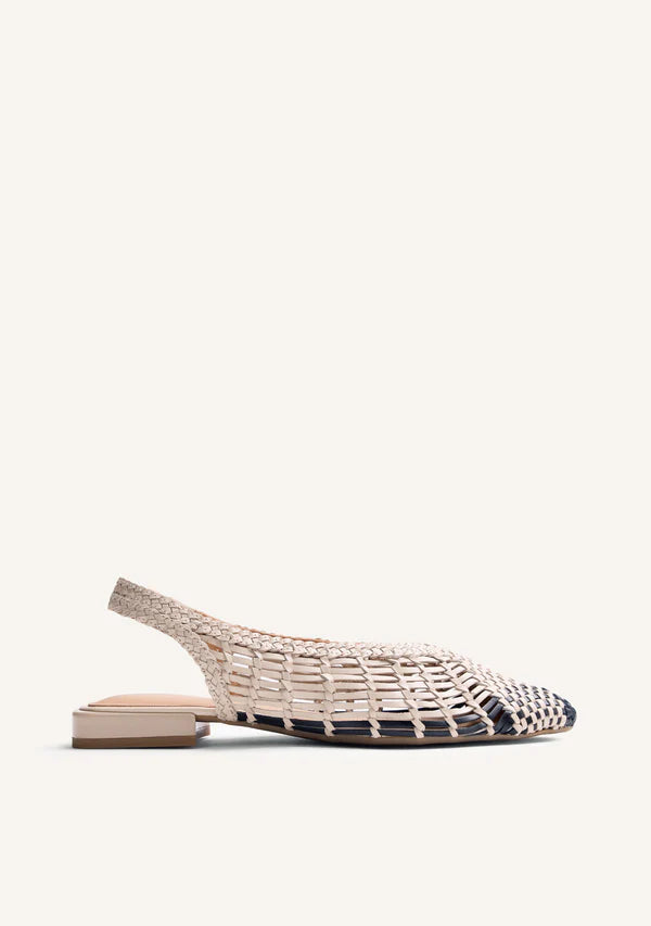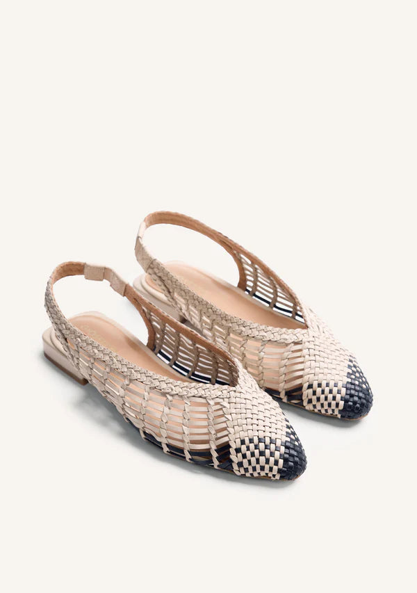 Slingback ballet flats made of leather with handmade two-tone braiding. Pointed toe. Ankle strap. Heel height: 1.5 cm. Leather upper, lining, and insole. Flexible TPR sole.