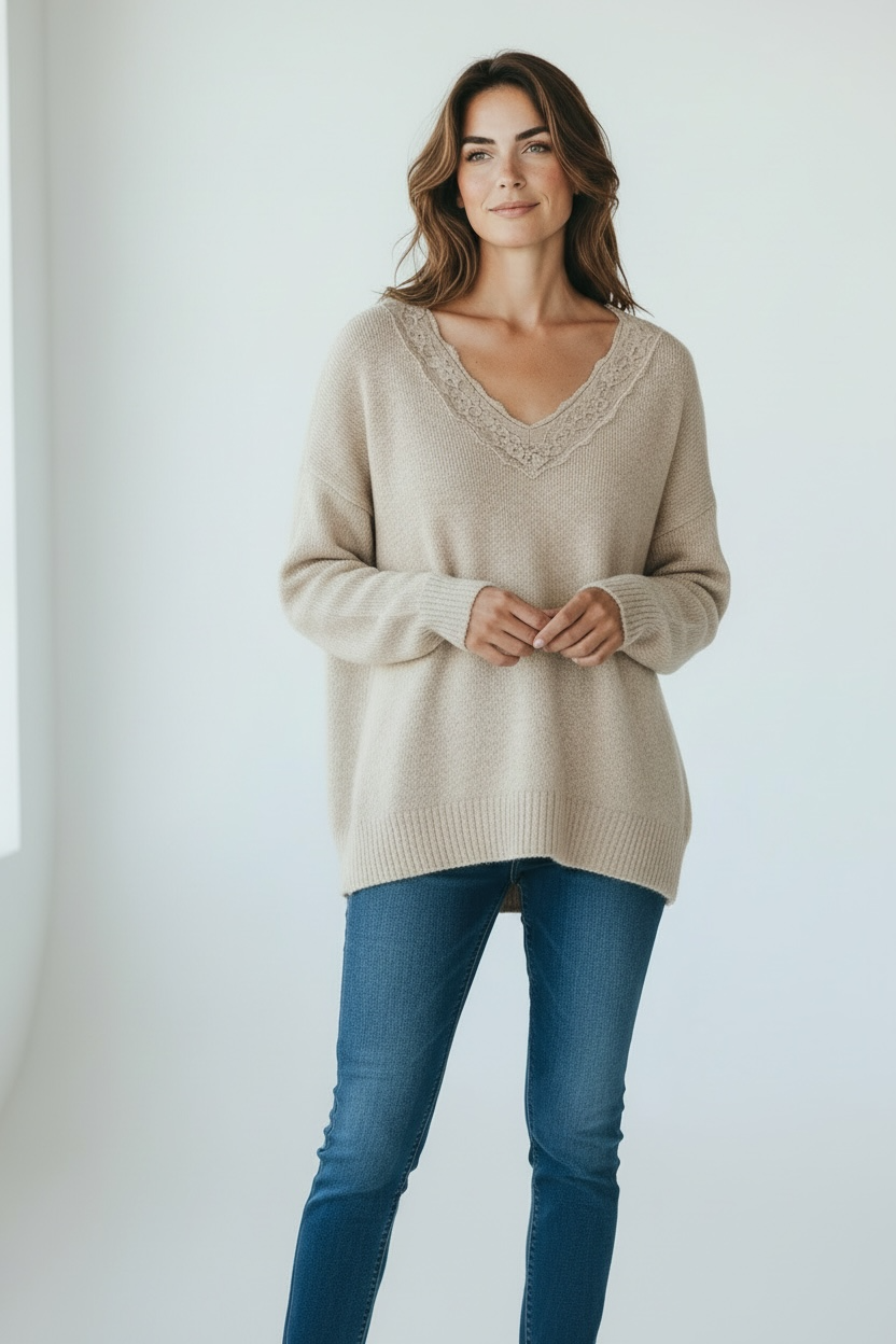 BEIGE PULLOVER WITH V CUT IN LACE
