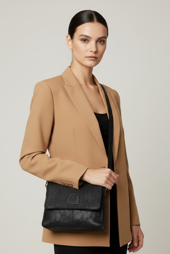 Modern leather in black snake-print with gold metal details, messenger bag with adjustable strap. It provides zipper, two internal cases and one external zip pocket at the back side.
