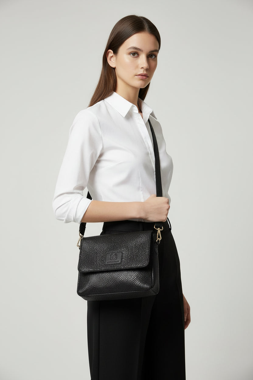Μοντέρνα δερμάτινη χιαστί τσάντα μαύρο φίδι -print δέρμα με χρυσά μέταλλα  . Διαθέτει ιμάντα ο οποίος αυξομειώνεται. Έχει φερμουάρ, δύο εσωτερικές θήκες και μία εξωτερική στην πίσω πλευρά.