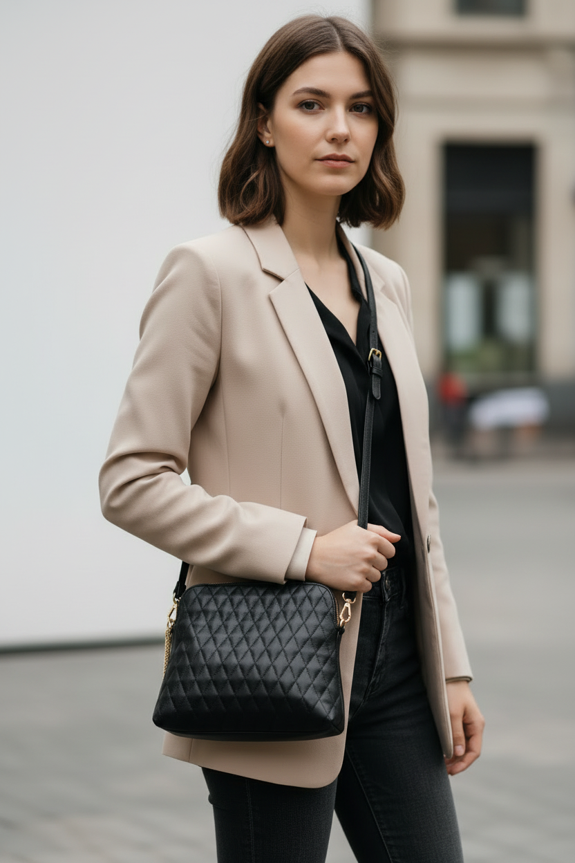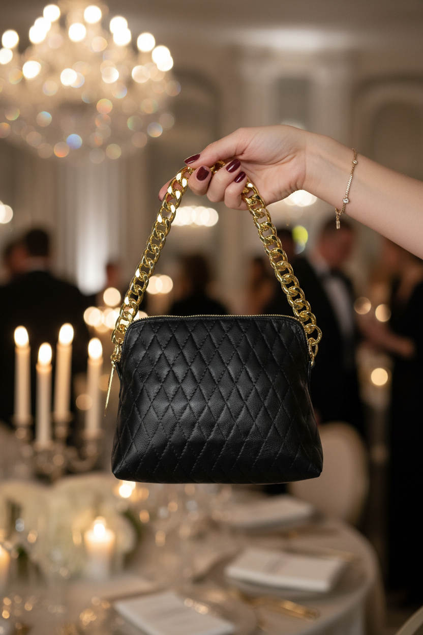 Δερμάτινη τσάντα σε καπιτονέ δέρμα στην μία πλευρά και μαύρο στην άλλη με χρυσά μέταλλα. Μπορεί να κρατηθεί ως βραδινό τσαντάκι αλλά και χιαστί με το έξτρα χρυσό λουρί που διαθέτει.