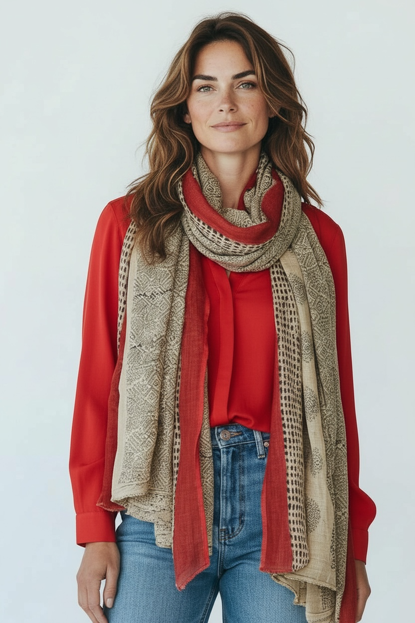 Beige paisley scarf with red details