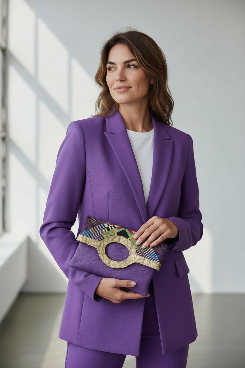 Μοναδική τσάντα χειρός διπλής όψης με art μοτίβο στην μία πλευρά και μωβ δέρμα στην άλλη. Διαθέτει δύο εσωτερικές θήκες και έξτρα ιμάντα που αυξομειώνεται για να κρατηθεί στον ώμο και χιαστί. Επιπλέον, μπορεί να διπλωθεί και να κρατηθεί ως φάκελος.