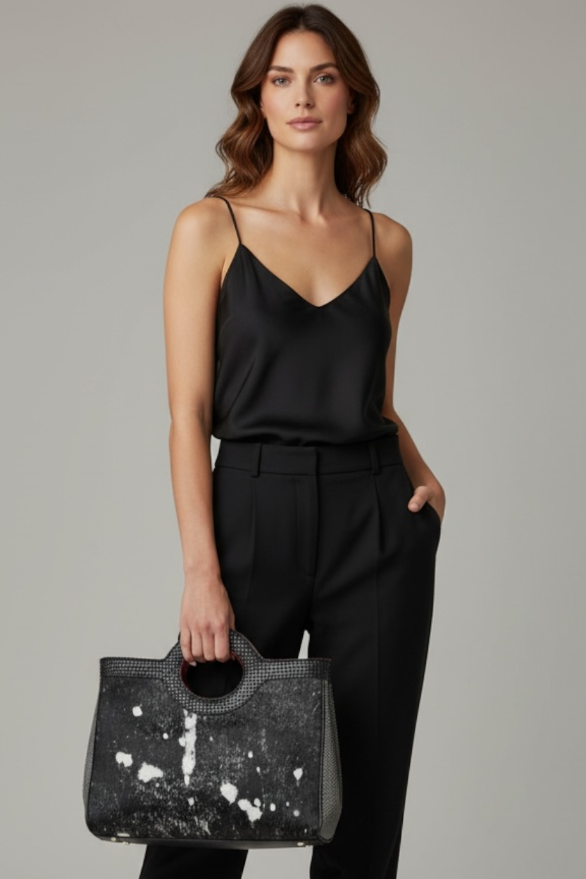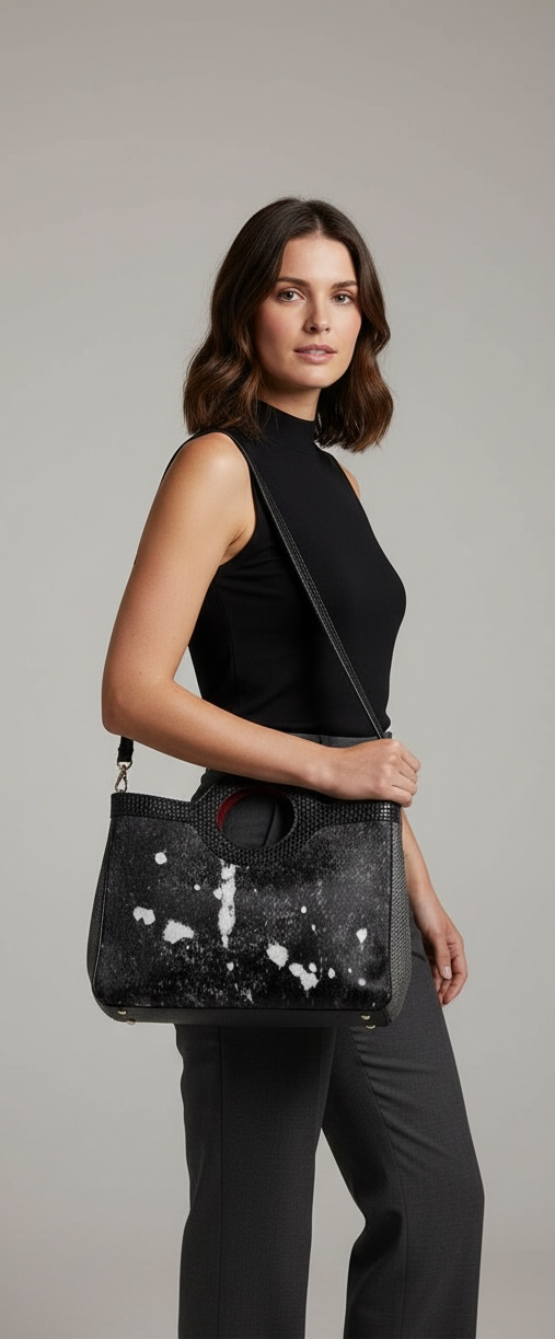 Εντυπωσιακή δερμάτινη τσάντα χειρός διπλής όψης σε μαύρο ασημί "πονυ σκιν" χρώμα στην μία πλευρά, μαύρο στην άλλη και κούμπωμα στα πλαϊνά για να αλλάζετε το στυλ και την χωρητικότητα της. Διαθέτει μία εσωτερική θήκη με φερμουάρ και μία ξεχωριστή για το κινητό ή τα κλειδιά. Επιπλέον, έχει έξτρα ιμάντα που αυξομειώνεται για να κρατηθεί χιαστί.