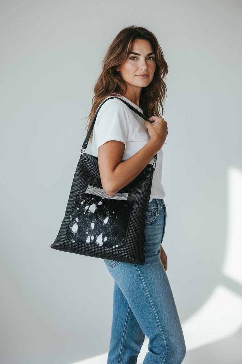 Black leather shoulder bag with multilayers art leather . It has lots of space with zippers closure. Also, it provides two internal cases and extra adjustable strap to hold it crossbody.